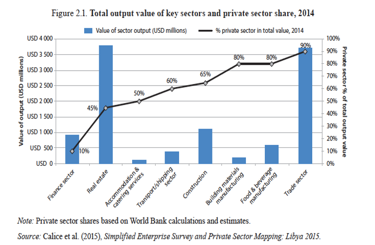 وضمن هذا السياق، يلعب القطاع الخاص الآن دوراً ضئيلاً في الاقتصاد الليبي، كما كان الحال حتى قبل 2011، لا يمثل سوى حوالي 5 في المائة من الناتج المحلي الإجمالي وحوالي 14 في المائة من العمالة (4.0 في المائة إلى 6.0 في المائة من العمال المستخدمين وحوالي 8.6 في المائة من العاملين لحسابهم الخاص). وتختلف حصة القطاع الخاص من القيمة الإجمالية بشكل كبير، والتي تتراوح من 90 في المائة في قطاع التجارة إلى 10 في المائة في القطاع المالي.